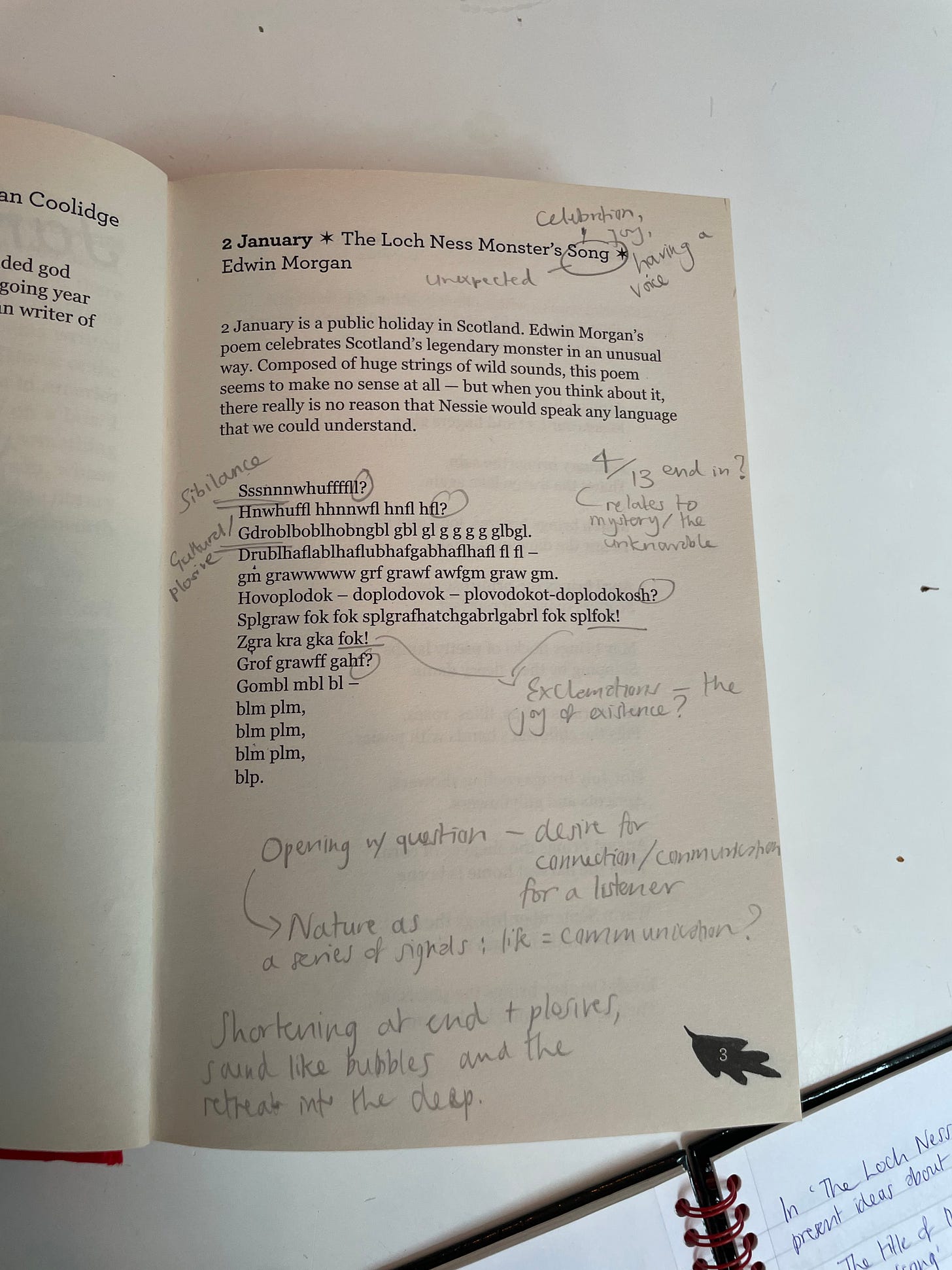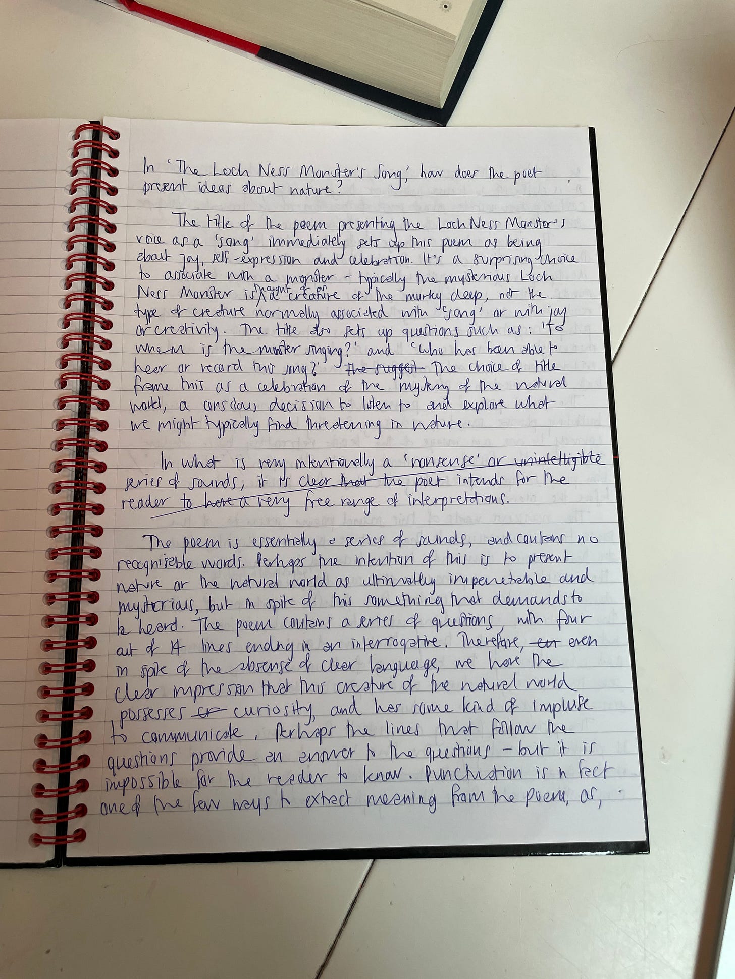 My essay response: The title of the poem, presenting the Loch Ness Monster’s voice as a ‘song’, immediately sets up this poem as being about joy, self-expression and celebration. It’s a surprising choice to associate with a monster - typically the mysterious Loch Ness Monster is thought to be a creature of the murky deep, not the type of creature normally associated with ‘song’, or with joy or creativity. The title also sets up questions such as ‘To whom is the monster singing?’ and ‘Who has been able to hear or record this song?’ The choice of title frames this as a celebration of the mystery of the natural world, a conscious decision to listen to and explore what we might typically find threatening in nature.